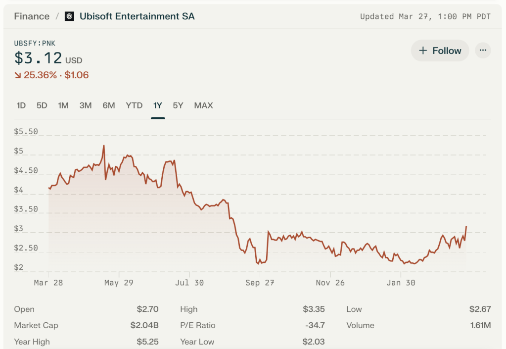 - Ubisoft’s stock has been quite volatile (52-week range: $2.03 – $5.25).
