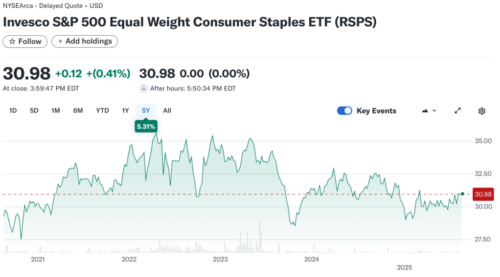 - Top 5 Holdings: Walmart, Costco, PepsiCo, Coca-Cola, Procter & Gamble
